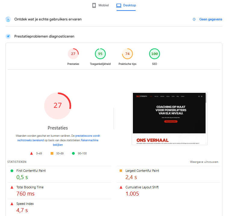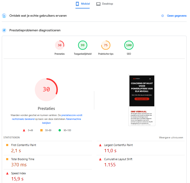 De initiële metingen via Google PageSpeed Insights gaven zorgwekkende scores: