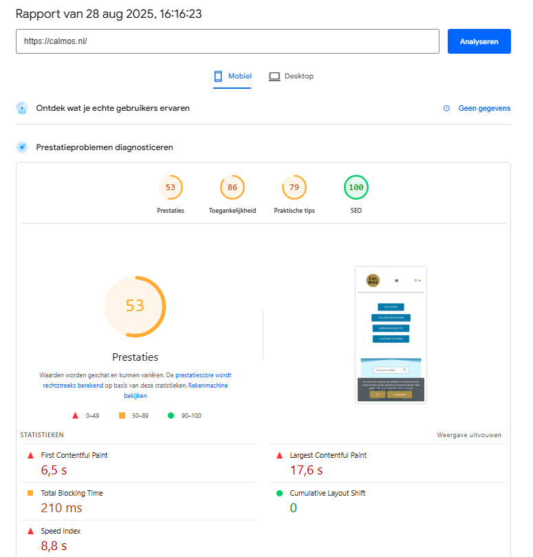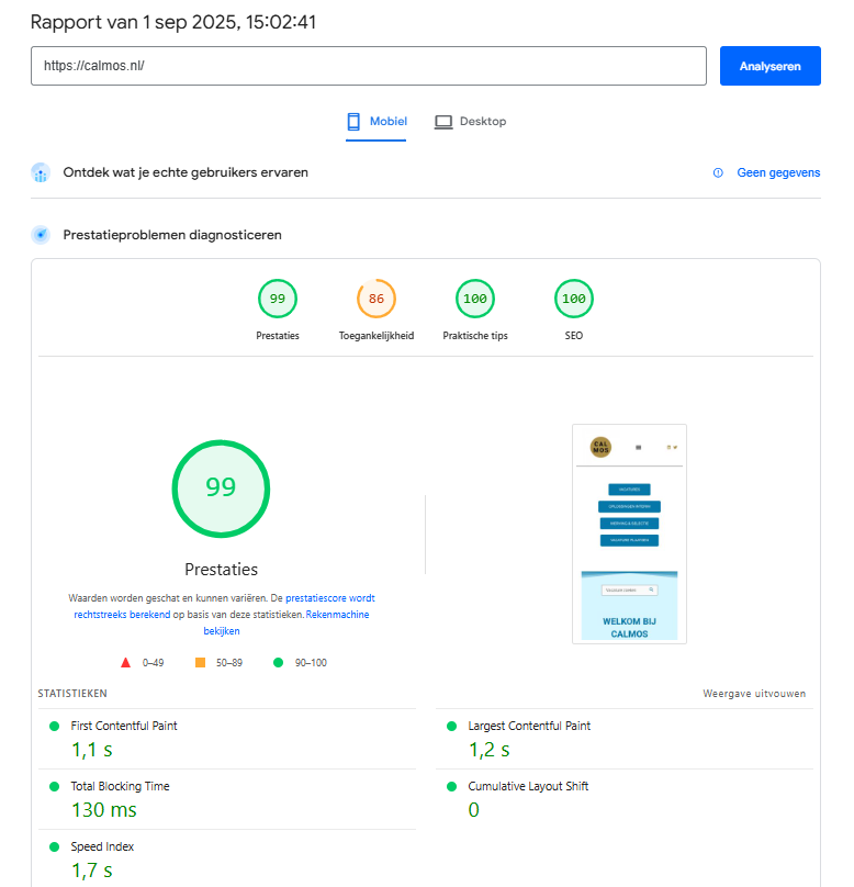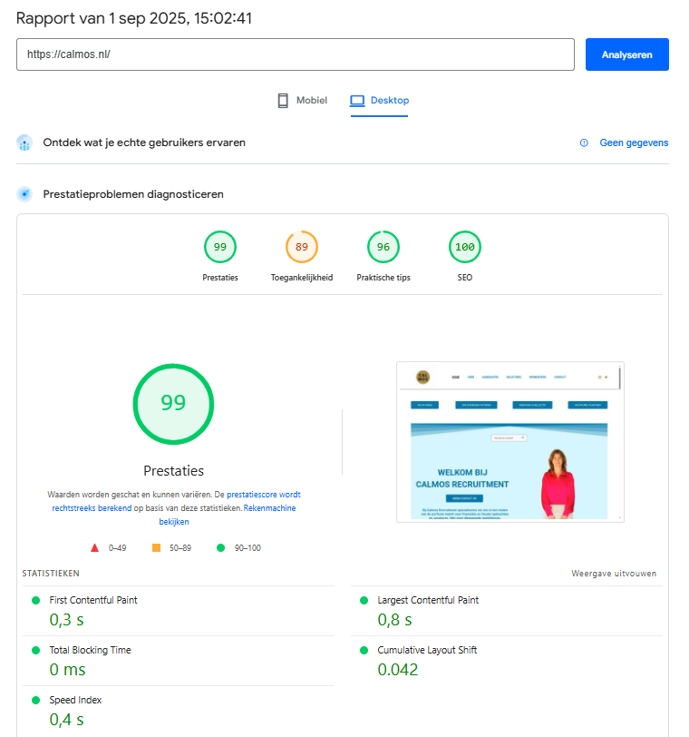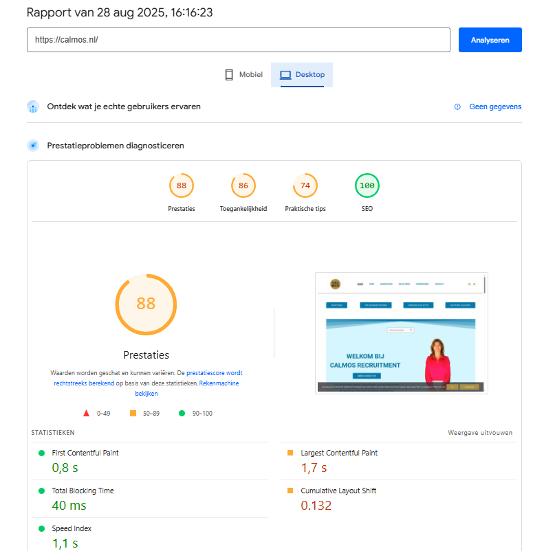 Vandaag laat ik zien hoe Calmos Recruitment, een wervingsbureau voor de zorgsector, hun website aanzienlijk wist te versnellen en optimaliseren — van trage laadtijden en matige prestaties naar een razendsnelle, foutloze site die nu in de hoogste klasse van Google PageSpeed scoort.